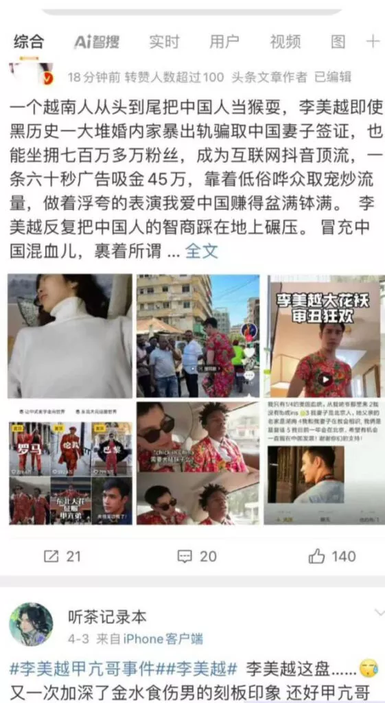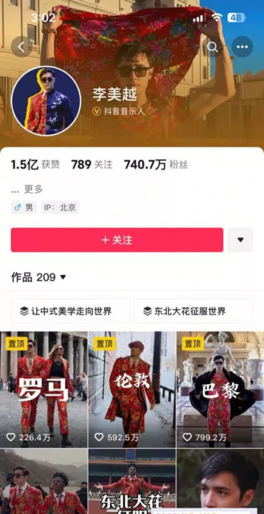 抖音750万粉丝大网红李美越,打造一手中华文化宣传的形象,宣称自己是中美混血儿,但有内幕人士指出其实是越美混血。自从发现流量密码之后,疯狂给自己立宣传中华文化的代表,疯狂吸纳700多万粉丝,一条60秒广告更是报价45万。