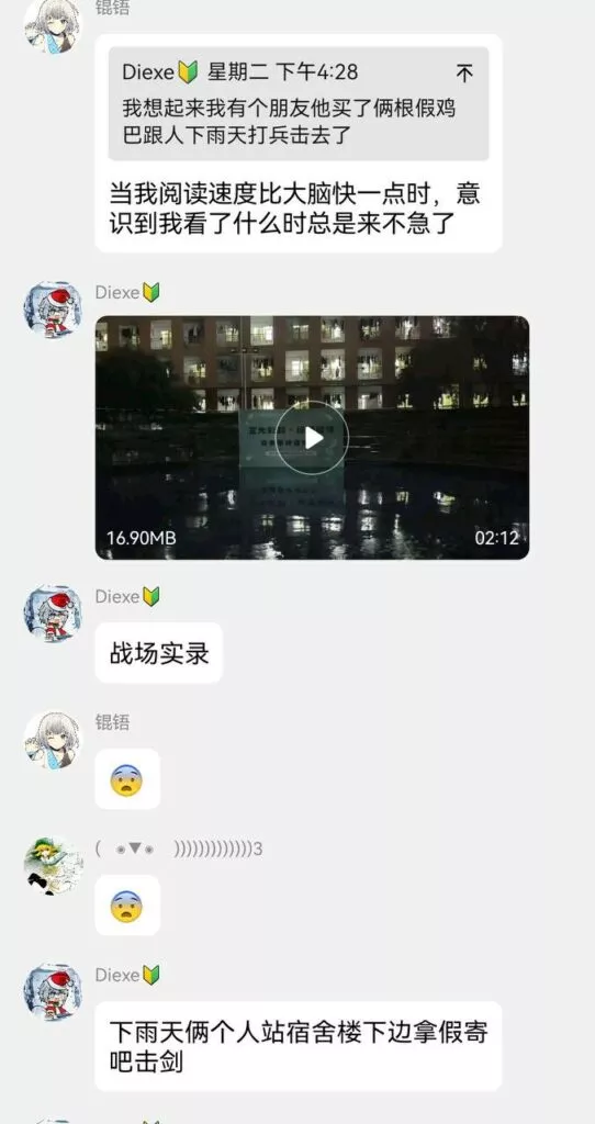 真的是太抽象了,不愧是影视学院的大学生,搞起抽象来,真的是让人看不懂。两位浙江横店影视职业学院的学生,相约在宿舍楼前拍一场决战,本以为是两个绝活哥,没想到是真的绝活,各自手持假JB开始了对决。
