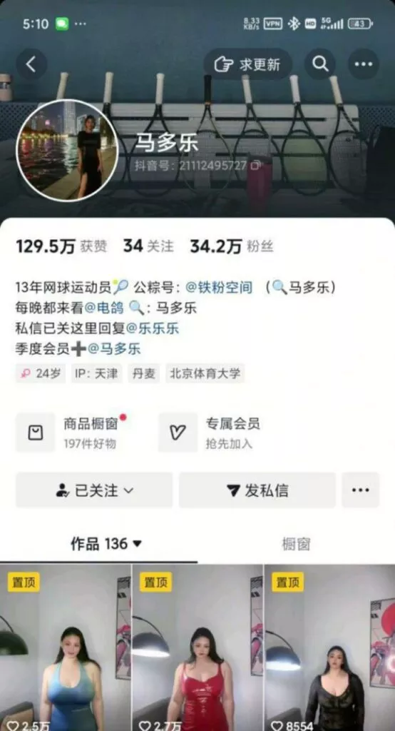 抖音34万粉丝13年网球运动马多乐被曝大尺度不雅视频