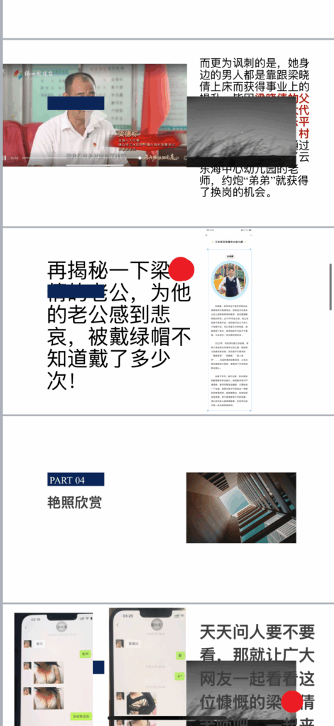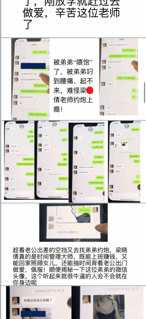 佛山市三水区教育界传出令人震惊的消息,女教师梁晓倩被曝出婚内出轨的丑闻。她的私密视频和聊天记录被曝光,内容令人瞠目结舌!相关聊天记录被整理成PPT格式广泛传播,震动了整个教育圈。