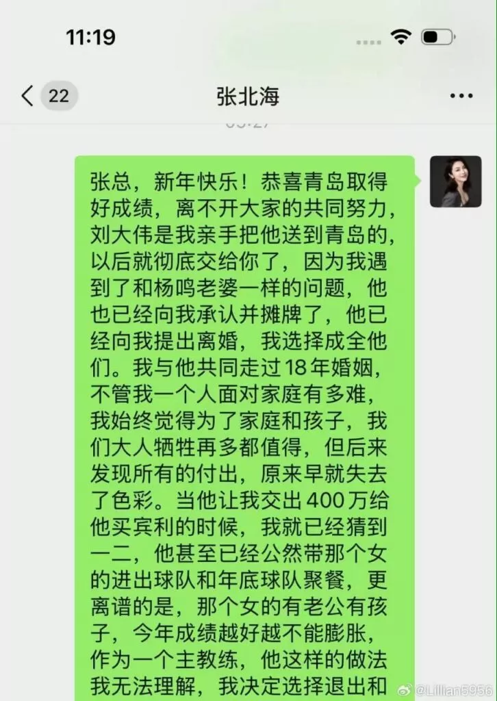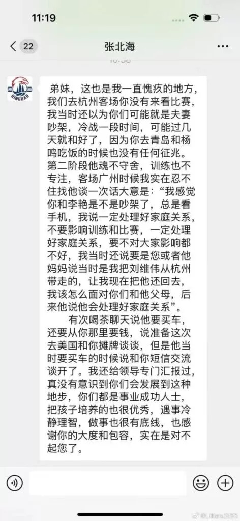 cba青岛国信男篮主教练刘维伟被妻子发文举报婚内出轨有夫之妇